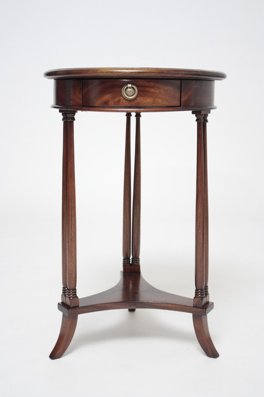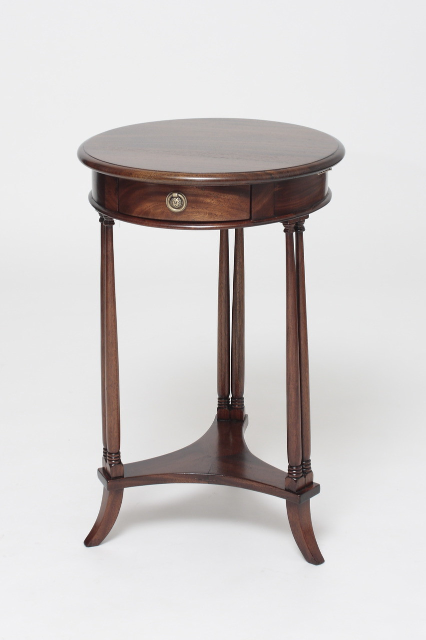 Whether you are looking for an authentic reproduction to decorate your living room or foyer, our signature mahogany round end table boasts a wide enough base to hold lamps, picture frames, or other prized possessions. Best of all, your new old-world end table includes a convenient bottom shelf to store address books, magazines, or catalogs for later use.